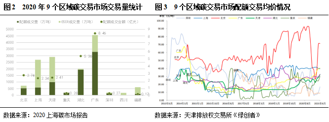 從2020年全國9個區(qū)域碳交易市場交易量來看,參考《2020上海碳市場報告》,2020 年,全國9個區(qū)域碳市場總交易量1.41 億噸,其中,配額成交量0.78億噸,CCER成交量0.63億噸。廣東碳交易市場成交量最大,接下來是天津、上海、湖北,其余碳交易市場成交量相對較小。配額交易價格方面,北京碳交易市場均價最高,2020年全年均價為51.41元/噸,其次是上海,2020年全年均價為30元/噸。各區(qū)域碳交易市場交易價格差別較大與各區(qū)域納入碳交易的行業(yè)范圍、標(biāo)準(zhǔn)、地區(qū)產(chǎn)業(yè)結(jié)構(gòu)等多方面有關(guān)。