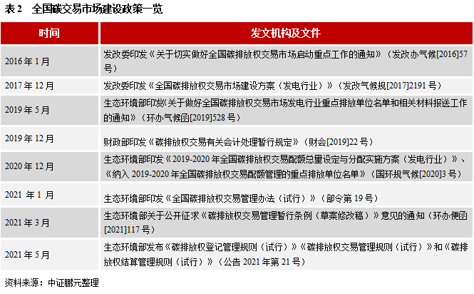 試點(diǎn)地區(qū)碳交易市場發(fā)展已有近8年,在促進(jìn)試點(diǎn)省市企業(yè)溫室氣體減排方面取得了成效,同時為全國碳交易市場的建設(shè)提供了借鑒的基礎(chǔ),在制度、人才、系統(tǒng)等方面積累了經(jīng)驗(yàn)。2017年12月,發(fā)改委印發(fā)《全國碳排放權(quán)交易市場建設(shè)方案(發(fā)電行業(yè))》,正式啟動全國碳排放交易體系,按照先易后難、穩(wěn)中求進(jìn)的安排,在發(fā)電行業(yè)(含熱電聯(lián)產(chǎn))率先啟動全國碳排放交易體系。2018年,應(yīng)對氣候變化與發(fā)展碳交易市場職責(zé)從發(fā)改委轉(zhuǎn)到生態(tài)環(huán)境部。2021 年1月,生態(tài)環(huán)境部印發(fā)《全國碳排放權(quán)交易管理辦法(試行)》,自2021 年2 月1 日起施行,正式啟動全國碳市場第一個履約周期。2021年3月30日,生態(tài)環(huán)境部關(guān)于公開征求《碳排放權(quán)交易管理暫行條例(草案修改稿)》意見的通知。除了以上政策,還發(fā)布了多項(xiàng)配套政策制度、技術(shù)規(guī)范等。在全國碳排放權(quán)交易機(jī)構(gòu)和注冊登記機(jī)構(gòu)成立前,由上海環(huán)境能源交易所和承擔(dān)全國碳排放權(quán)交易系統(tǒng)賬戶開立和運(yùn)行維護(hù)等具體工作,由湖北碳排放權(quán)交易中心承擔(dān)全國碳排放權(quán)注冊登記系統(tǒng)賬戶開立和運(yùn)行維護(hù)等具體工作。