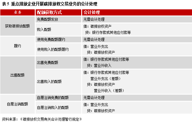 根據(jù)《碳排放權(quán)交易有關(guān)會計處理暫行規(guī)定》,重點(diǎn)排放企業(yè)在資產(chǎn)負(fù)債表中的“其他流動資產(chǎn)”項(xiàng)目下設(shè)“碳排放權(quán)資產(chǎn)”科目,其開展碳排放權(quán)交易業(yè)務(wù)的會計處理如表5所示。根據(jù)企業(yè)碳排放配額的獲取方式不同,交易業(yè)務(wù)的會計處理也不同。我們繼續(xù)以前文所述A企業(yè)和B企業(yè)為例進(jìn)行說明。對A企業(yè)來說,其實(shí)際排放量小于免費(fèi)配額發(fā)放量,所以無需購入配額來履約,如果最后A企業(yè)選擇將結(jié)余的10噸免費(fèi)配額轉(zhuǎn)至下年度使用,則全程無需會計處理,如果最后A企業(yè)選擇將結(jié)余的10噸免費(fèi)配額出售,則僅需在出售配額時做“借:銀行存款或其他應(yīng)付款等 貸:營業(yè)外收入”會計處理,獲取營業(yè)外收入。對B企業(yè)來說,其實(shí)際排放量大于免費(fèi)配額發(fā)放量,需要購入配額來履約,對于免費(fèi)配額的獲取和履約無需會計處理,但是對于購入配額的獲取和履約則分別需要做如下會計處理“借:碳排放權(quán)資產(chǎn) 貸:銀行存款或其他應(yīng)付款等”、“借:營業(yè)外支出 貸:碳排放權(quán)資產(chǎn)”。