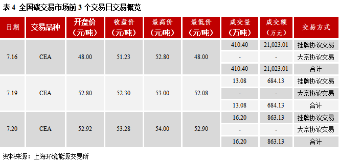 全國碳交易市場已于2021年7月16日開市。在全國碳排放權(quán)交易機(jī)構(gòu)和注冊登記機(jī)構(gòu)成立前,分別由上海環(huán)境能源交易所和湖北碳排放權(quán)交易中心承擔(dān)相關(guān)工作。開市3個交易日,碳排放配額累計成交量439.67萬噸,7月20日收盤價53.28元/噸,開市3個交易日實(shí)現(xiàn)三連漲。