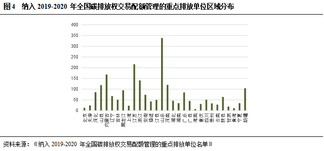 從納入2019-2020 年全國碳排放權(quán)交易配額管理的重點(diǎn)排放單位區(qū)域分布來看,排名前三的區(qū)域?yàn)樯綎|、江蘇、內(nèi)蒙古,分別有338家、216家、168家。
