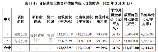 根據國融興華出具的初始評估報告,截至2022年3月31日,投資性房地產資產組價值為70,400.00萬元和51,000.00萬元,合計為121,400.00萬元,折合單價分別為6,237元/平方米和5,952元/平方米。