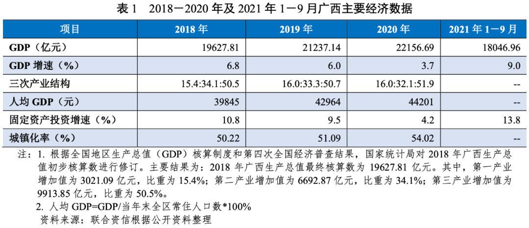 廣西壯族自治區(qū)(以下簡稱“廣西”)地處中國西南部,經(jīng)濟總量處于全國中下游水平,人均GDP排名靠后。2020年,受新冠肺炎疫情影響,廣西經(jīng)濟增速及固定資產(chǎn)投資增速均明顯放緩。2021年前三季度,廣西經(jīng)濟增速及固定資產(chǎn)投資增速均同比大幅增長。
