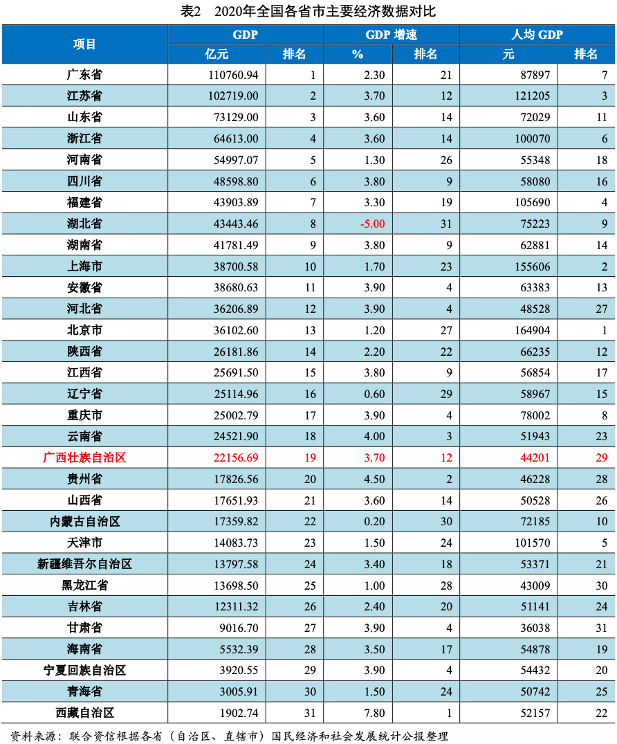 從經(jīng)濟運行方面看,近年來廣西經(jīng)濟總量不斷增長,但增速有所放緩。2020年,廣西地區(qū)生產(chǎn)總值(GDP)位居全國第19名,處于全國中下游水平。2018-2020年,廣西GDP增速持續(xù)放緩,2020年GDP增速高于全國GDP增速1.40個百分點。2018-2020年,廣西人均GDP逐年提高,2020年廣西人均GDP為全國平均水平的0.61倍,位居全國第29名。廣西三次產(chǎn)業(yè)結構由2018年的15.4:34.1:50.5調整為2020年的16.0:32.1:51.9,第三產(chǎn)業(yè)比重大幅提高。固定資產(chǎn)投資方面,2020年,廣西全年固定資產(chǎn)投資同比增長4.2%,高于全國平均增速,增速較2019年的9.5%明顯放緩。