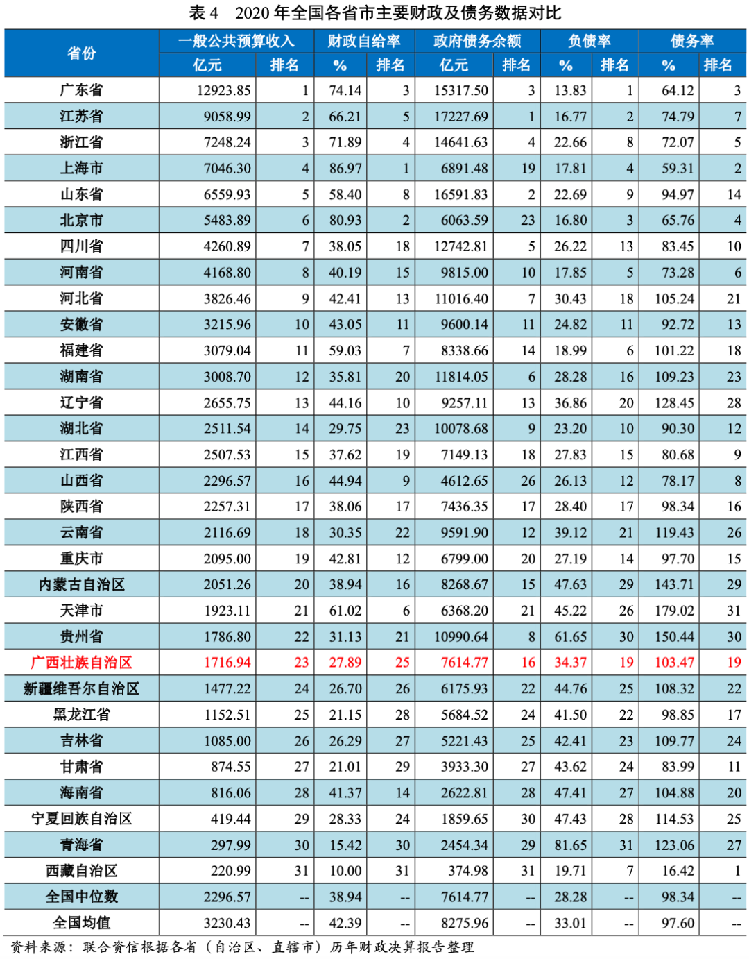受新冠疫情影響,2020年廣西自治區(qū)政府一般公共預算收入有所下降,規(guī)模在全國排名處于下游,財政自給率較弱,上級補助對廣西自治區(qū)政府綜合財力提供了有力支撐。廣西自治區(qū)政府負債率在全國排名中下游(按照債務負擔輕重排序),地方政府債務負擔相對較輕;政府債務率在全國排名中下游(按照償債能力強弱排序),償債能力一般。