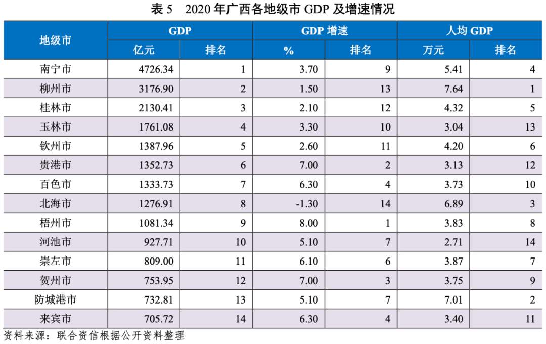 截至2020年底,廣西共轄14個地級市,依據(jù)《廣西壯族自治區(qū)主體功能區(qū)規(guī)劃》分為北部灣經(jīng)濟區(qū)4市(南寧市、北海市、欽州市和防城港市)、西江經(jīng)濟帶7市(柳州市、桂林市、玉林市、貴港市、梧州市、賀州市和來賓市)和桂西資源富集區(qū)3市(百色市、崇左市和河池市)。北部灣經(jīng)濟區(qū)和西江經(jīng)濟帶經(jīng)濟實力強于桂西資源富集區(qū)。