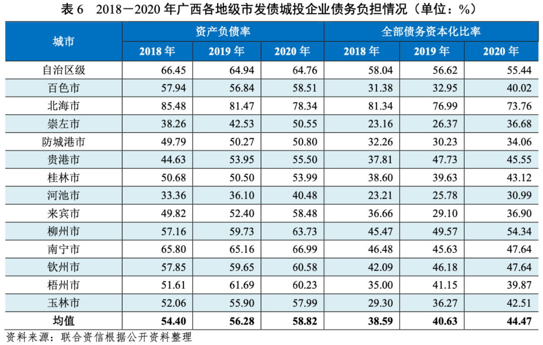 從發(fā)債城投企業(yè)債務負擔來看,2018-2020年,廣西整體發(fā)債城投企業(yè)資產(chǎn)負債率和全部債務資本化比率均值呈持續(xù)上升趨勢。其中,2018-2020年,自治區(qū)級、北海市和柳州市城投企業(yè)債務負擔相對較重。