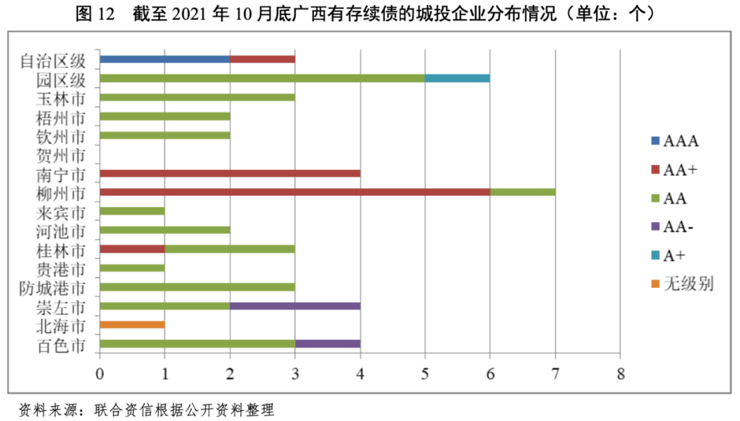 從各地市城投企業(yè)數(shù)量來看,自治區(qū)級城投企業(yè)3家,柳州市7家,崇左市、南寧市和百色市各4家,防城港市、桂林市和玉林市各3家,其他各地級市以1~2家城投企業(yè)為主,賀州市無存續(xù)城投債。