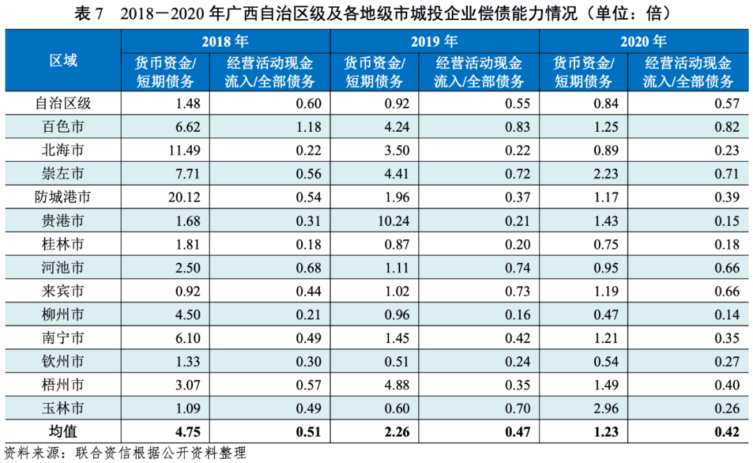 城投企業(yè)的經(jīng)營活動現(xiàn)金流入主要包括業(yè)務回款、政府往來款等。2018-2020年,廣西自治區(qū)級及各地市城投企業(yè)經(jīng)營活動現(xiàn)金流入/全部債務均值分別為0.51倍、0.47倍和0.42倍,逐年下降。截至2020年底,北海市、貴港市、桂林市、柳州市、欽州市和玉林市城投企業(yè)經(jīng)營活動現(xiàn)金流入對全部債務的覆蓋程度很低,不足0.30倍。