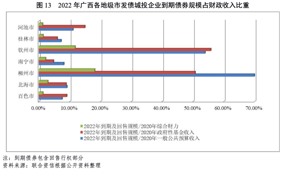 以發(fā)債城投企業(yè)2022年到期債券規(guī)模占一般公共預算收入、政府性基金收入和綜合財力的比重來近似衡量2022年城投債券的到期償還能力,到期償還能力最弱的城市為柳州市,柳州市發(fā)債城投企業(yè)2022年到期債券占地方政府一般公共預算收入、政府性基金收入和綜合財力的比重分別為69.89%、50.65%和18.08%,其次欽州市到期償還壓力也較大,除柳州市及欽州市外,廣西各地級市財力對區(qū)域內城投企業(yè)的到期債券的覆蓋程度均較高。