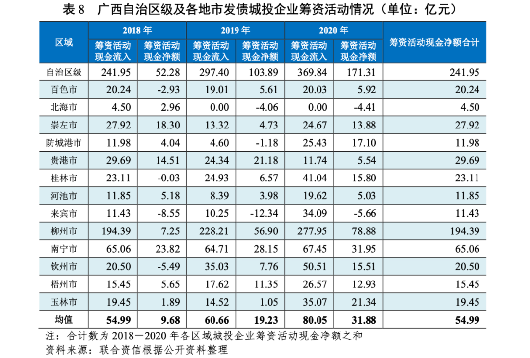 從廣西自治區(qū)級及各地市發(fā)債城投企業(yè)籌資活動凈現(xiàn)金流狀況看,2018-2020年,自治區(qū)級、南寧市及柳州市城投企業(yè)融資能力明顯強于其他區(qū)域。2020年,北海市和來賓市償還了較多債務,籌資活動現(xiàn)金流為凈流出,其他地級市發(fā)債城投企業(yè)籌資活動現(xiàn)金流均表現(xiàn)為凈流入。