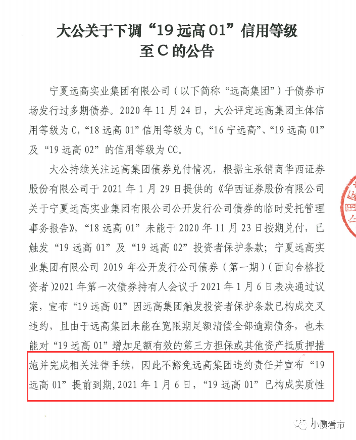 由于遠高集團未能在寬限期足額清償全部逾期債務,也未能對“19遠高01”增加足額有效的第三方擔保或其他資產抵質押措施,因此該債提前到期,2021年1月6日“19遠高01”已構成實質性違約。