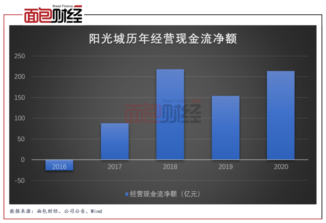 現(xiàn)金流方面,陽(yáng)光城2020年產(chǎn)生經(jīng)營(yíng)性凈現(xiàn)金流入213.54億元,相比2019年的153.96億元明顯增加。截至2020年末,公司賬面擁有貨幣資金498.05億元。