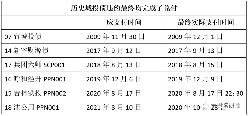 (二)事實上,過去多筆城投違約事件似乎都在循環著這一過程。例如,07宜城投債、14新密財源債、17兵團六師SCP001、16呼和經開PPN001、15吉林鐵投PPN002、18沈公用PPN001等前期違約的債券最終均完成了兌付。