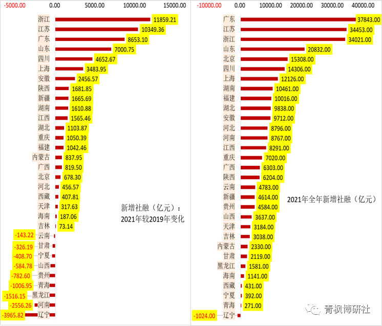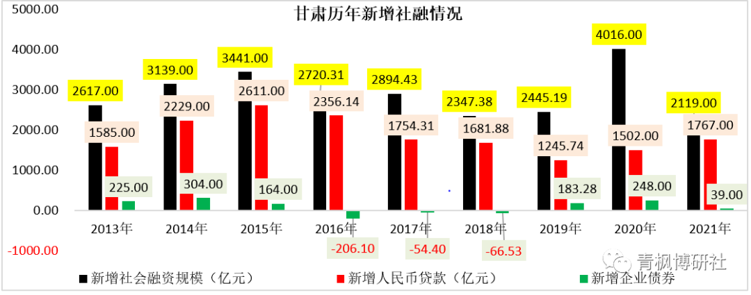 我們梳理了2013年以來甘肅地區的歷年新增社融和人民幣貸款情況。整體整體上看,除2020年這一特殊年份外,金融體系對甘肅體系的支持支持力度實際上是在不斷減弱,也即金融體系對甘肅地區的認可度呈逐步下降態勢。例如,2021年全年,甘肅全省的新增社融與人民幣貸款分別為2119億元和1767億元,,明確低于2014-2017年的水平,新增社融體量更是創下了新低紀錄。