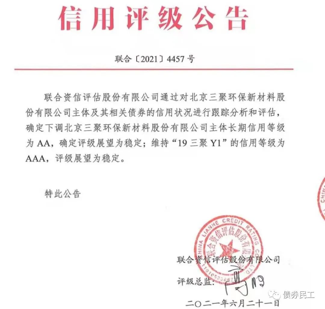 根據北京三聚環保新材料股份有限公司(以下簡稱“三聚環保”)于2021年6月22日披露的公開信息,聯合資信評估股份有限公司將三聚環保的主體信用評級由AA+下調至AA,評級展望為穩定,維持“19三聚Y1”的信用等級為AAA。本次主體信用評級下調的原因可能包括公司收入及主營業績大幅下降、轉型過程中經營成果存在不確定性和曾被列為失信被執行等。