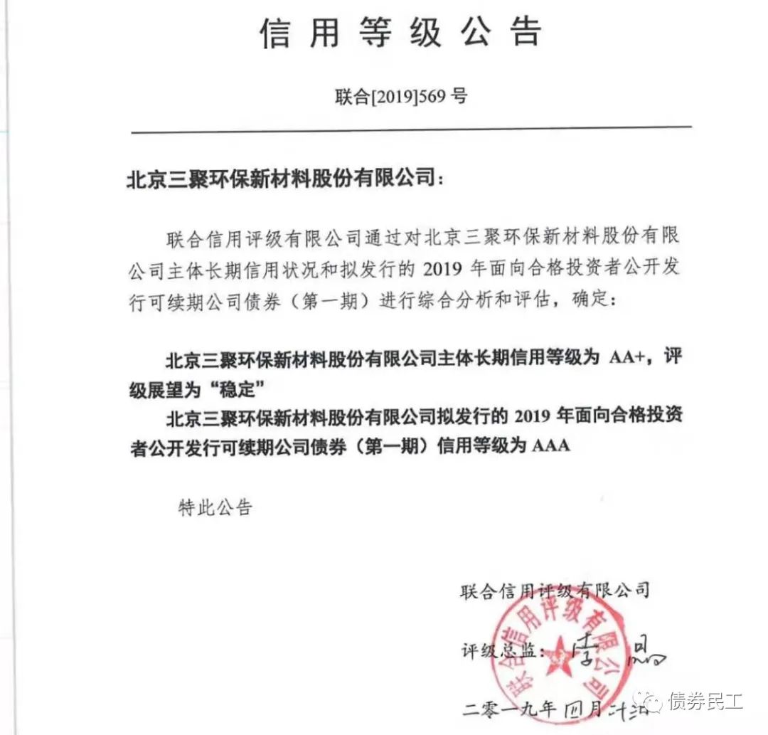 三聚環保曾發行過短期融資券、PPN、私募債和小公募,目前存量債券只有19三聚Y1,為可續期公司債券,債券余額為3.33億元,由北京市海淀區國有資產投資集團有限公司(以下簡稱“海淀國投”)提供不可撤銷連帶責任擔保。三聚環保于2019年4月23日取得聯合資信的AA+主體信用評級,并于2019年4月30日發行了可續期小公募公司債券。