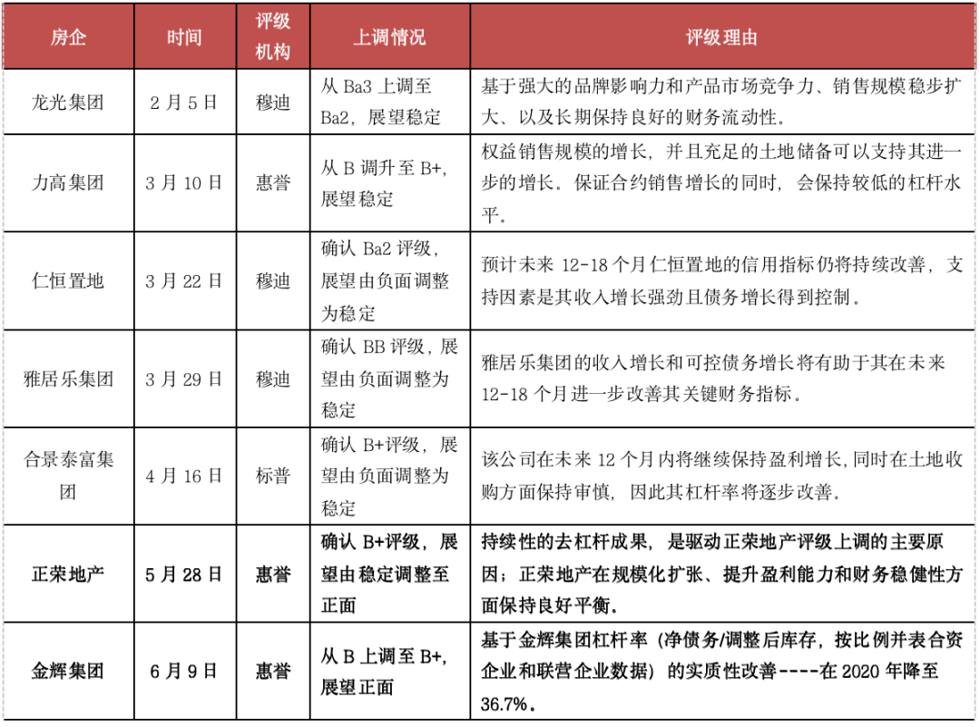 值得注意的是,在房企信用評級紛紛下調的大背景下,2021年仍有多家房企的信用評級被評級機構上調。
