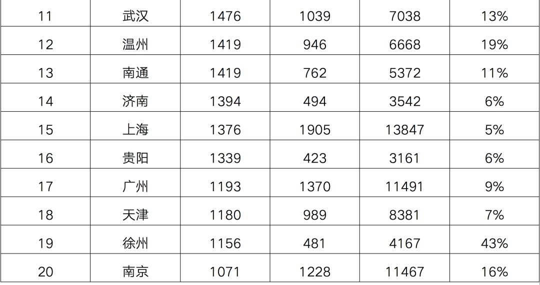 前三季度土地成交建面TOP20中,一線城市中上海、廣州雖榜上有名,不過與去年同期相比,供地力度同比均有所下滑。三四線城市中,本次入榜的五個城市除保定外,其余均來自長三角地區(qū),分別是鹽城、溫州、南通和徐州,并且排名均排在第10名及以后。