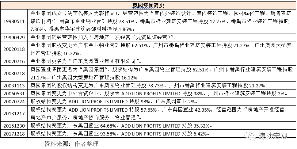 1、奧園集團有限公司成立于1998年5月(法定代表人為郭梓寧、位于廣州市番禹區(qū)、廣東奧園置業(yè)持股93.58%、ADD LION PROFITS LIMITED持股6.42%),最終實控人為郭梓文。