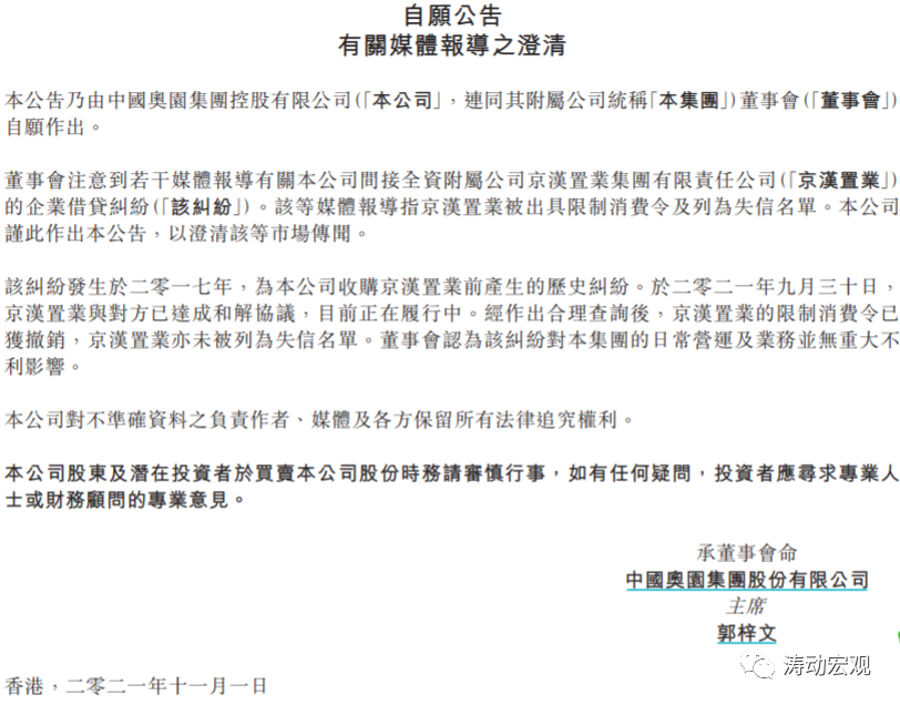 今年10月底,市場傳言奧園系子公司京漢置業(yè)因借貸糾紛成為失信執(zhí)行人,引發(fā)中國奧園股債雙殺。雖然2021年11月1日,中國奧園發(fā)布公告澄清,但市場對奧園系的流動性擔憂依然存在。不過近期奧園正在謀劃出售京漢置業(yè)事宜。