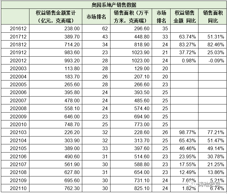 今年前10個月,奧園地產的權益銷售金額和銷售面積分別為762.30億元和825.10萬平方米,同比分別增長1.82%和6.74%,數(shù)據(jù)上看還可以。不過奧園地產在全國地產行業(yè)中的排名這幾年一直處于上升態(tài)勢,從2016年的62名(按權益銷售金額)和35名(按銷售面積)提升至2019年的20名左右,但2020年以來奧園系的市場排名回落至30位左右。