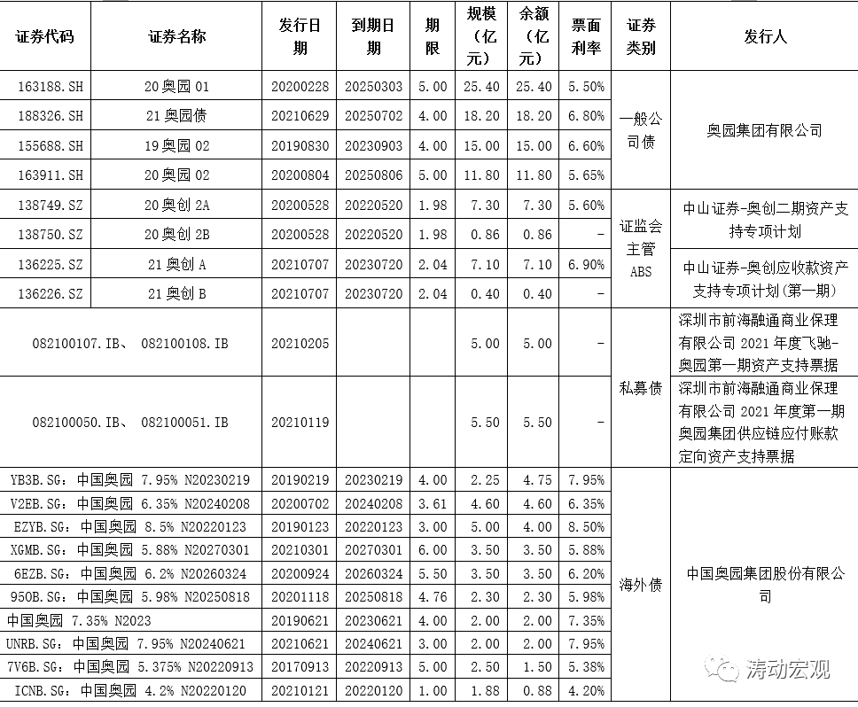 1、目前奧園系共有20只存量債券,分別為10只境內債券(余額合計達到96.56億元人民幣)和10只境外債(余額合計達到29.03億美元),前者由奧園集團有限公司為主體發(fā)行,后者則由中國奧園集團為主體發(fā)行。
