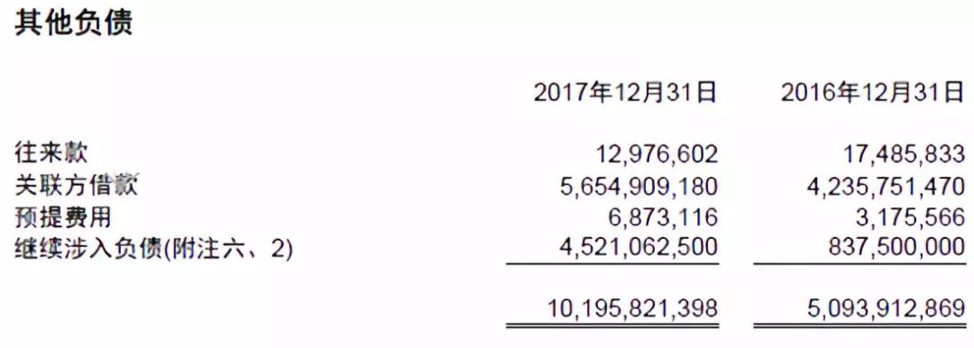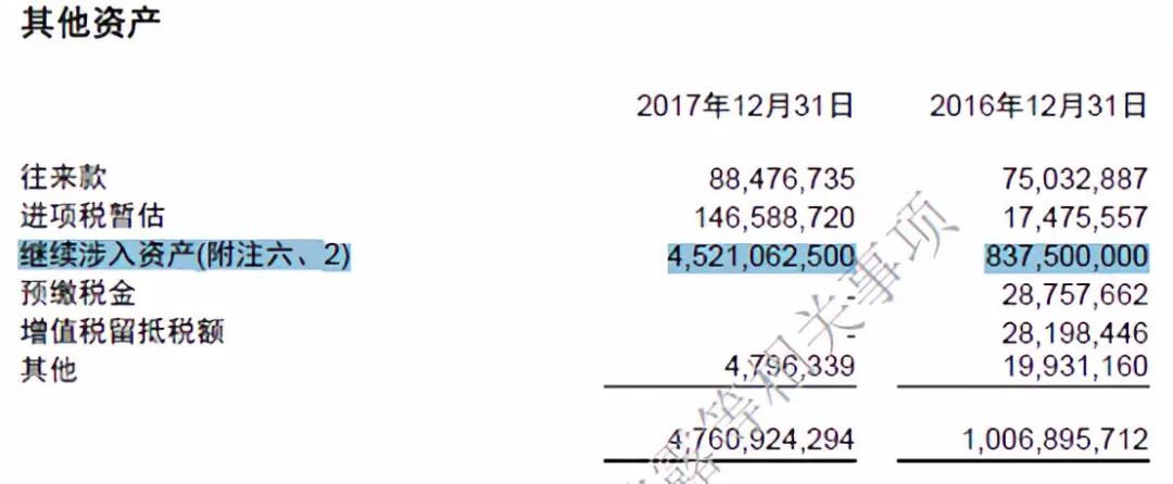 商誠小貸對繼續(xù)涉入資產(chǎn)和負債的表述如下:“截至2017年12月31日,本集團因繼續(xù)涉入確認的資產(chǎn)的賬面價值為人民幣4,521,062,500元(2016年12月31日:人民幣837,500,000元),與之相關(guān)的負債為人民幣4,521,062,500 元(2016 年12 月31 日:人民幣837,500,000元),分別計入繼續(xù)涉入資產(chǎn)和繼續(xù)涉入負債,該等負債金額表示本集團因持有次級檔計劃,收益分配處于次級而導致可能不能收回的最大現(xiàn)金流。”