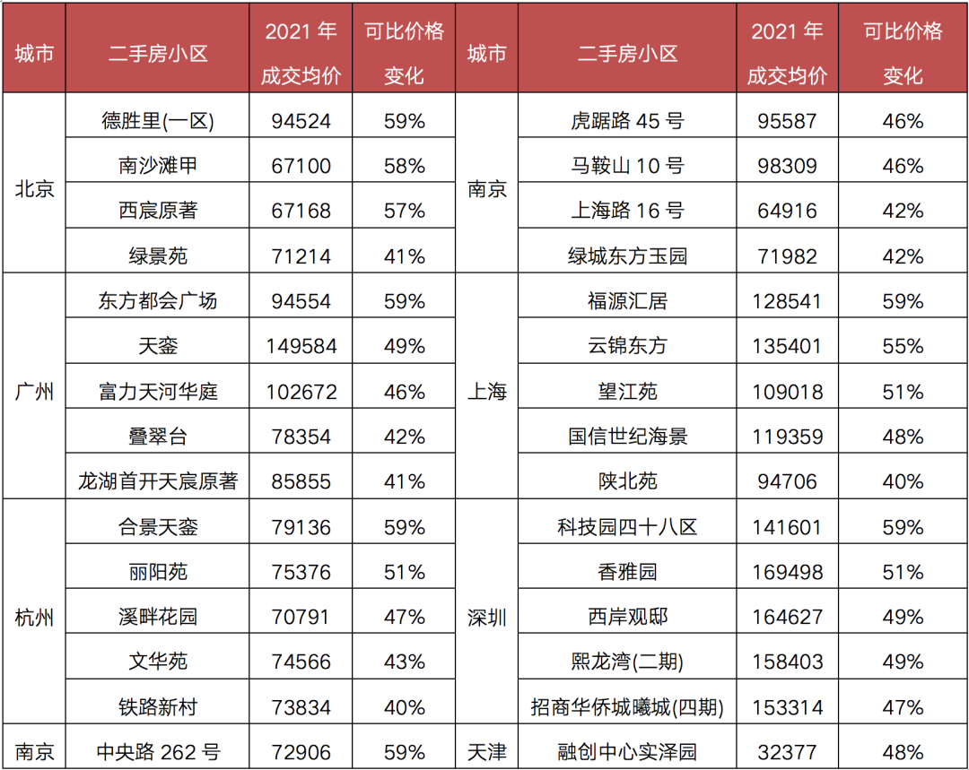 漲幅超40%在售高檔二手房小區(元/平方米)