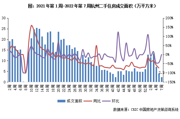 2022年第7周,杭州二手住房收至2.2萬平方米,較之去年同期顯著增長。2021年下半年以來杭州二手房市場持續下行后保持低位震蕩,1月杭州市場成交短期放量增長后再度回落,年后首周市場仍較為冷清,基于前期表現來看后市仍有回升可能。