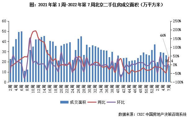 22022年第7周,北京二手房成交面積為16.4萬平方米,較去年同期由跌轉增至44%。本周北京二手房市場成交較節前仍有一定距離,預計短期內市場規模仍在低位后續或有回升。