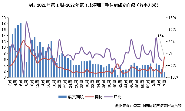 2022年第7周,深圳二手房成交2.8萬平方米,同比降幅收窄至15%。深圳二手房市場長期低位震蕩,受政策高壓當前市場觀望情緒仍然濃重,后市大概率延續走勢。