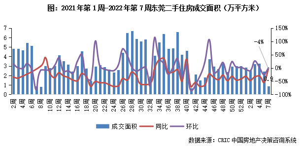 2022年第7周,東莞二手住房成交面積收0.9萬平方米,同比跌幅收至4%。,本周成交規模創年內新低,受節后供應影響整體市場有所回落但后續或快速回暖。