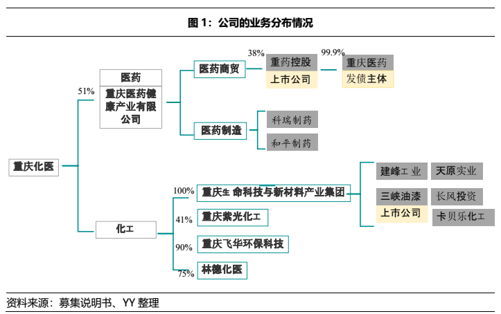 公司有醫(yī)藥、化工兩大板塊,醫(yī)藥板塊以醫(yī)藥流通為主,有少量的醫(yī)藥制造,均已被整合至重慶醫(yī)藥健康產(chǎn)業(yè)有限公司體內(nèi),醫(yī)藥板塊已經(jīng)形成較為獨(dú)立的整體,有自己的發(fā)債平臺(tái)、上市融資平臺(tái),融資和經(jīng)營(yíng)都較為獨(dú)立。
