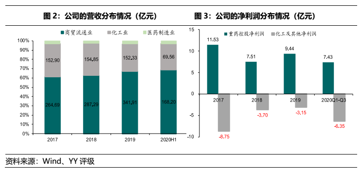 公司的營(yíng)業(yè)收入主要由醫(yī)藥商貿(mào)和化工構(gòu)成,但是凈利潤(rùn)主要來(lái)源于醫(yī)藥商貿(mào),化工板塊雖然營(yíng)收體量不小,但是常年處于虧損狀態(tài),成為集團(tuán)的包袱。