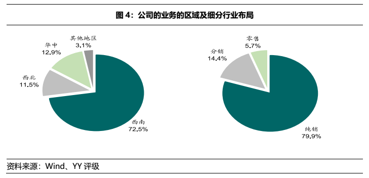 重慶醫(yī)藥是重慶最大的醫(yī)藥流通企業(yè),深耕西南地區(qū),業(yè)務(wù)以純銷(約80%)、藥品銷售(90%+)為主。
