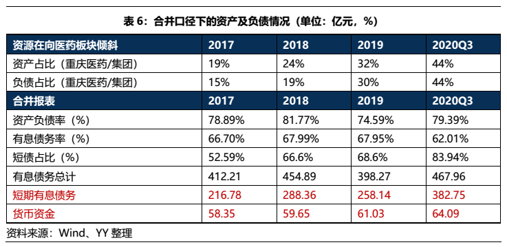 集團(tuán)層面來(lái)看,其財(cái)務(wù)弊病是母公司和重慶醫(yī)藥二者的集合。由于近幾年在著重培育醫(yī)藥板塊、縮減化工板塊,集團(tuán)新增的負(fù)債和資產(chǎn)基本都集中于此,導(dǎo)致集團(tuán)新增債務(wù)的問(wèn)題基本源于重慶醫(yī)藥,此外母公司的遺留問(wèn)題也是成為一大包袱。