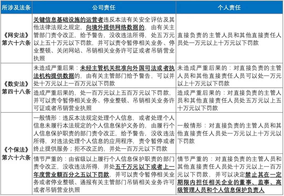 在管轄權重疊導致諸多企業面臨數據出境兩難困境的背景之下,我們需要提示的是,如果違反境內數據出境相關規則,可能會面臨如下責任: