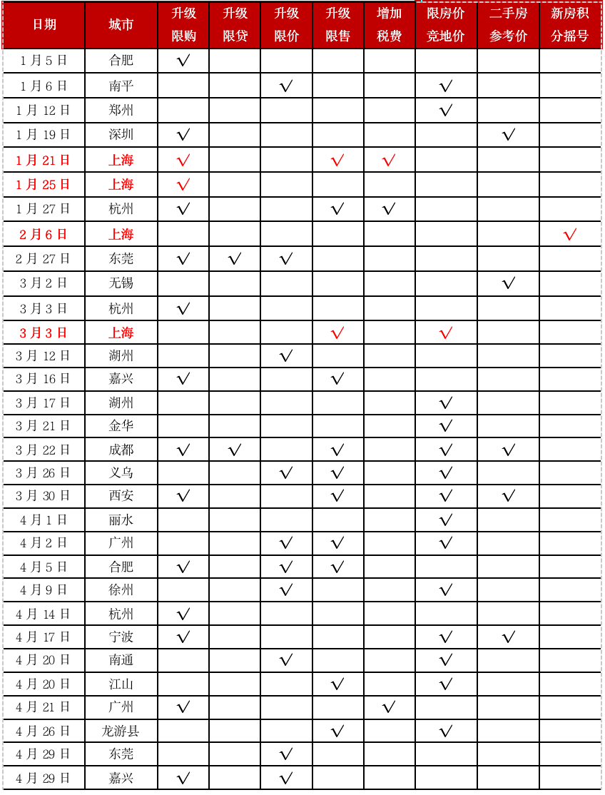 為落實穩地價、穩房價、穩預期目標,合肥、深圳、東莞、成都等近30城相繼升級調控,并“下沉”到衢州下轄的江山市、龍游縣這類熱點縣市,重點涉及升級限購、升級限貸、升級限價、升級限售、增加房地產交易稅費、設立二手房參考價格、新房積分搖號等內容。其中,上海連番6次政策加碼,嚴堵政策監管漏洞,堪稱本輪房地產調控的風向標。