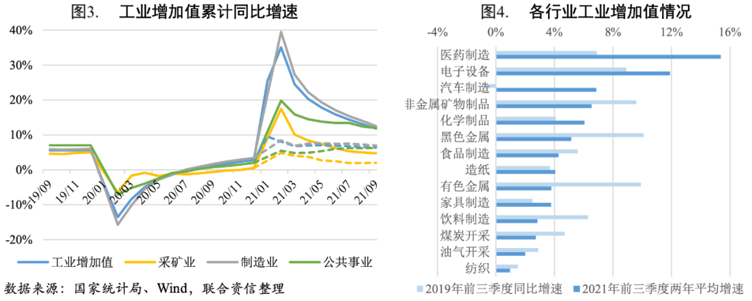 主要行業(yè)[3]方面,醫(yī)藥制造業(yè)、計算機(jī)、通信和其他電子設(shè)備制造業(yè)以及汽車制造業(yè)受出口帶動前三季度工業(yè)增加值兩年平均增速較高,但受芯片、電池等供應(yīng)鏈短缺影響,三季度特別是8月汽車制造產(chǎn)能擴(kuò)張承壓;而黑色、有色金屬冶煉及延壓加工業(yè)和非金屬礦物制品業(yè)工業(yè)增加值較2019年下降較大,主要是限電限產(chǎn)等措施對鋼鐵、有色和水泥等高耗能行業(yè)產(chǎn)能負(fù)面影響較大,其中黑色金屬冶煉及壓延加工業(yè)工業(yè)增加值兩年平均增速繼續(xù)下滑,除了供給端的限制外,還受到需求端地產(chǎn)降溫的影響。