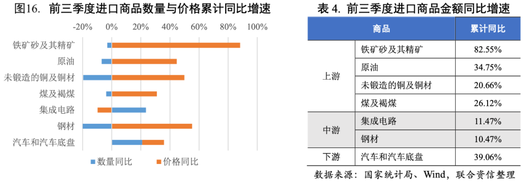 三季度以來,進(jìn)口增速呈現(xiàn)逐步下行的趨勢,部分大宗商品量減價揚,國際大宗商品價格的上漲抑制了部分國內(nèi)需求。從主要進(jìn)口商品看,前三季度鐵礦砂及其精礦是進(jìn)口增速的主要支撐項,但從三季度開始,其進(jìn)口數(shù)量也逐步下行,或與國內(nèi)房地產(chǎn)投資走弱相關(guān)。四季度,各地“雙限”政策的實施疊加冬季環(huán)保政策,或?qū)?dǎo)致國內(nèi)工業(yè)生產(chǎn)放緩,導(dǎo)致對海外原料的需求下降,預(yù)計進(jìn)口將出現(xiàn)金額和數(shù)量雙降。