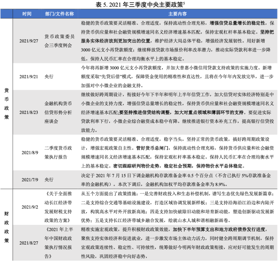 2021年三季度,貨幣政策方面,年內(nèi)首次下調(diào)金融機(jī)構(gòu)存款準(zhǔn)備金率0.5個百分點釋放長期資金約1萬億元,新增3000億元支小再貸款額度加大支持小微企業(yè)力度,整體來看三季度信貸總量增長穩(wěn)定,同時突出信貸結(jié)構(gòu)調(diào)整;財政政策方面,地方政府債的發(fā)行進(jìn)度有所加快,財政支出呈增長趨勢。“碳中和”要求與“能耗雙控”行動下,限電限產(chǎn)政策在三季度有所加碼。