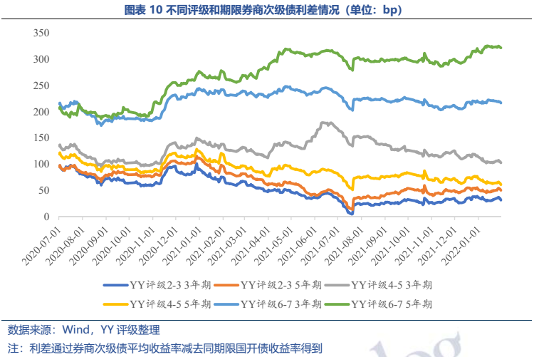 目前現存券商次級債多為可用于補充附屬凈資本的長期次級債,YY評級在2-3以及5-6+的頭部和腰部券商為發行主力,發行人資質整體較優。相對于銀行二級資本來說,券商次級債條款設置較為友好,目前存續債均未附減記條款且永續次級債尚無延期情況出現。收益率分級別來看,頭部和尾部近年分化加大,利差已擴大至200bp。