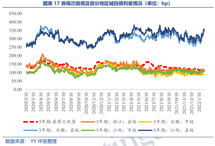 供需格局方面,券商作為重要金融資源之一,多為央企或地方政府實控,承擔著擴容資本市場和提高直接融資比重的使命;歷史來看,監管對以往違規操作和風險暴露券商的處置落地整體較為穩妥且以警示為主,券商持續經營假設較為成立。因此,作為唯一可用于補充凈資本的債券,券商次級債供給規模預計將維持較高水平;而主體的持續經營假設也賦予了其債券產品較厚的安全邊際,高于中部市級城投和浙江縣級城投的收益率也帶來一定性價比優勢,預計后續配置熱情也將持續。