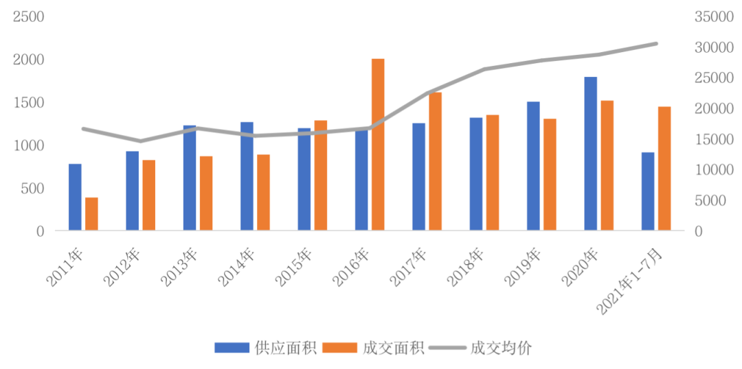 圖:2011年-2021年前7月杭州商品住宅供求量價(jià)(單位:萬平方米、元/平方米)