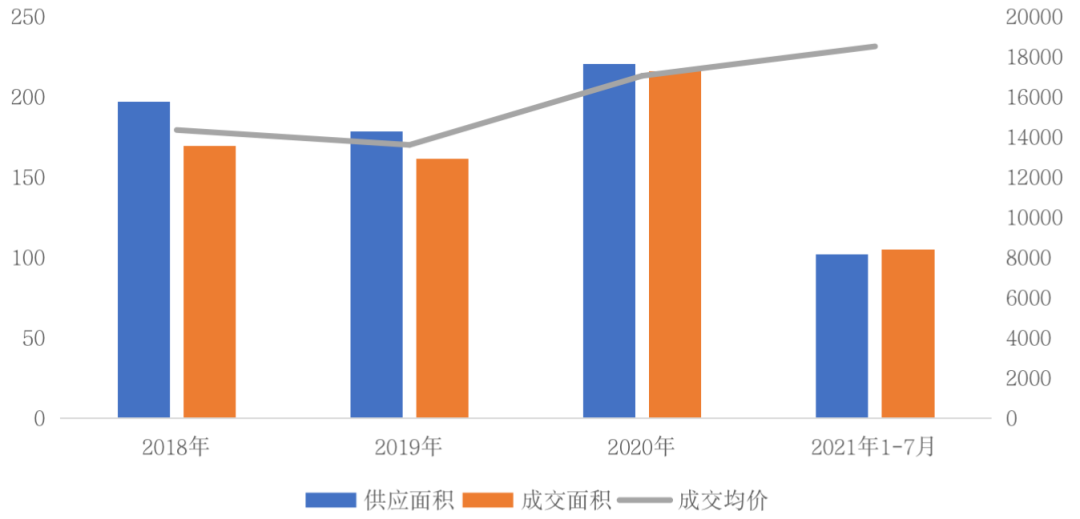 圖:2018年-2021年前7月金華主城區(qū)商品住宅供求量價(jià)(單位:萬平方米、元/平方米)