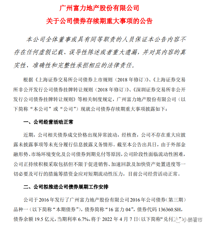 據(jù)了解,“16富力04”將于2022年4月7日到期兌付,但富力地產(chǎn)預(yù)計(jì)無法籌措到足額兌付資金,擬與債券持有人溝通債券展期事宜。