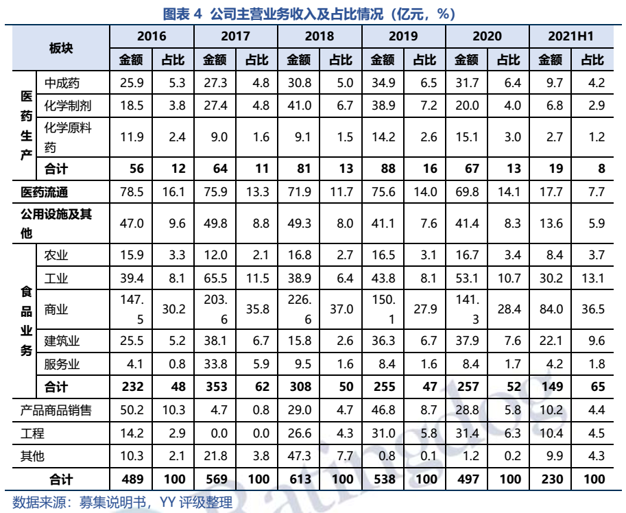 公司主營業(yè)務包括醫(yī)藥生產(chǎn)及醫(yī)藥流通板塊(已出表)、食品業(yè)務板塊、公共設施及其他等,核心子公司包括天津醫(yī)藥、天津食品、津聯(lián)集團等。近年來收入規(guī)模持續(xù)收縮,目前子公司中,天津醫(yī)藥和中環(huán)集團已完成混改,天津醫(yī)藥出表,對公司主營業(yè)務合并層面影響較大,未來可比性弱。