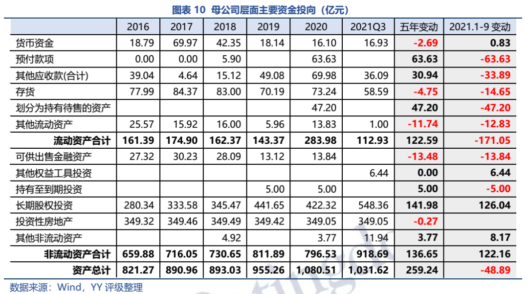 母公司層面,依賴子公司運營為主,本部僅為融資屬性,營收較少,利潤依賴于資產(chǎn)處置。母公司資產(chǎn)集中在長股投和投資性房地產(chǎn)上,投資性房地產(chǎn)主要是2.5萬畝鹽田,短期變現(xiàn)能力弱。長股投規(guī)模持續(xù)增長,但多數(shù)市場化程度低,市場化程度較高/變現(xiàn)能力較強的合計約71.25億元。