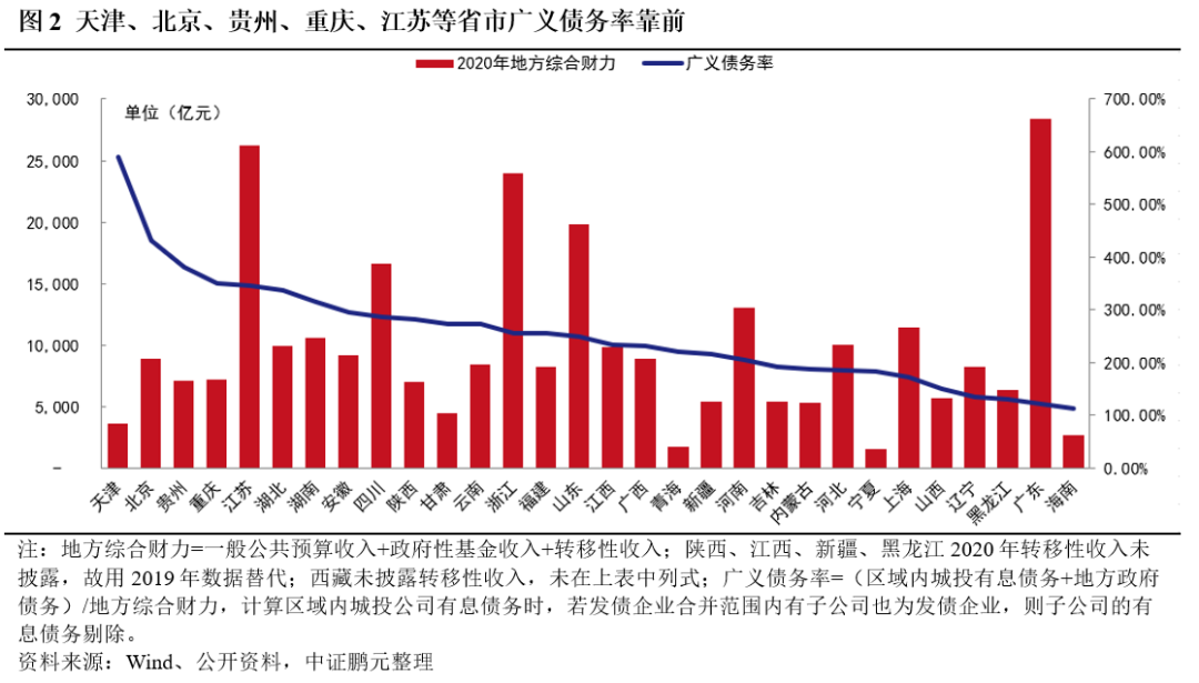 今年以來出臺的監管政策以嚴控地方政府債務風險為核心,雖然交易所及交易商協會對城投公司分檔的標準未對外公布,但地區的債務水平是重要的考量因素,且對于區域的劃分更加細化,衡量各省市的廣義債務率水平仍可作為重要的參考。從各省份的廣義債務率來看,天津、北京、貴州、重慶、江蘇等省市靠前,分別達到590.78%、430.73%、381.32%、349.56%及345.62%,江蘇的廣義債務率雖高,但其經濟發展水平靠前,地方綜合財力居于前列。公司債發行指引則更多的旨在對弱資質城投公司融資的限制,城投公司的資質則與區域經濟發展水平及融資環境、主體資產規模、所屬層級等因素密切相關,部分經濟發展水平落后區域的城投公司發債也會受到一定限制。